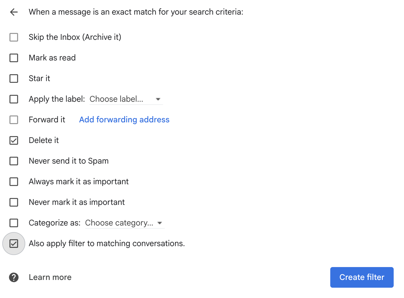 4. In the "Create Filter" section. Select "Delete It" and optional choose if you have received more than one email from the same sender also choose "Also apply filter to matching conversations". Once you select your filter(s) click "Create Filter."